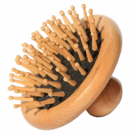 Hårborste i trä, rund, diameter 8 cm. En praktisk hårborste. Lätt att ta med sig överallt!